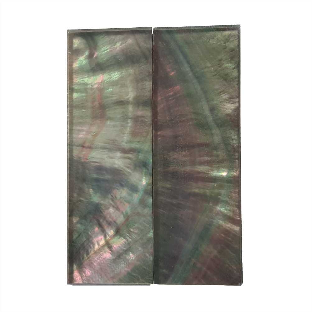 Made from real mother of pearl with a clear acrylic layer over the shell material and a black backing. Great for inlays and scales as it is highly iridescent as you roll it back and forth in light.