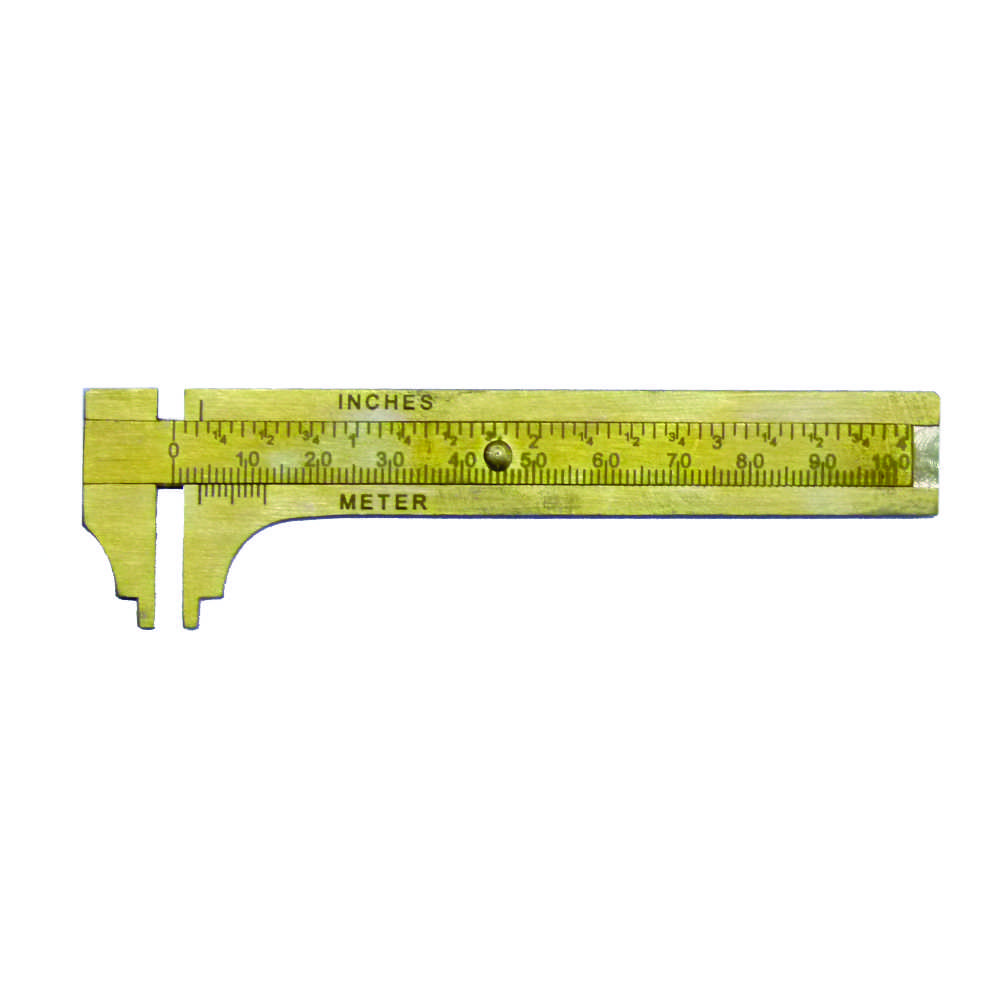 This solid brass gauge offers a combination of inches and millimetres. It features notched jaws for inside and outside measurements. Perfect for measuring metal sheet and wire