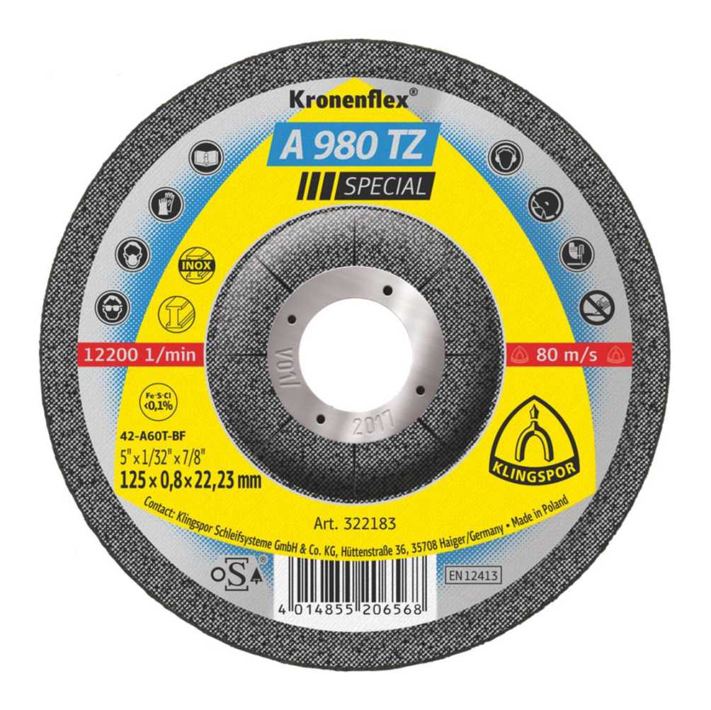 The Kronenflex cut-off wheels A 980 TZ Special makes it possible to cut stainless steel, steel and non-ferrous metal in a neat and fast manner. Kronenflex cut-off wheels are free of iron, sulphur and chlorine. They are further distinguished by their fast cutting times, allowing the user to finish their work in exceedingly short time. Another benefit is the minimum burr formation, doing away with the need for extensive rework.