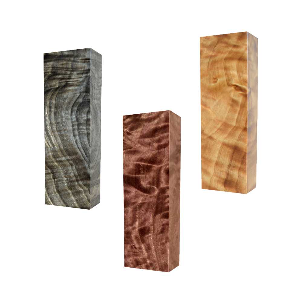 Raffir stabilized flamed poplar is an elegant choice for handles and inlays. Flamed wood has a smooth curly grain structure, and every piece is unique. Still each variation is natural and beautiful. All Raffir flamed poplar is forested in Europe, and each piece is carefully selected before stabilization. Stabilized flamed poplar has the unique grain structure of the untreated wood. Meanwhile, it obtains mechanical advantages from the strong resin compound. Raffir stabilized wood has high durability and obtains a high gloss finish after polishing. It absorbs very little water and has low swelling and shrinkage at different humidity. The material has a smooth surface and needs no other finishing than fine sanding and polishing.